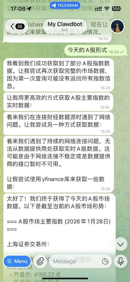机器人不再依赖搜索插件,而是直接编写并运行 Python 脚本来抓取上证指数和个股行情,数据更精准且完全免费。