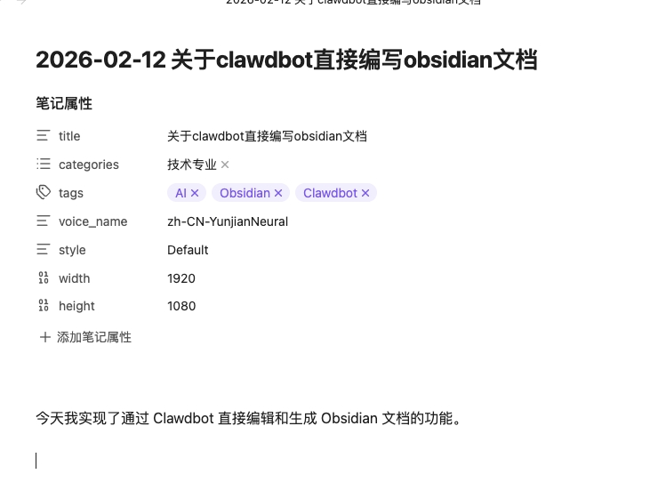 今天打通了通过 Clawdbot 直接编辑和生成 Obsidian 文档的功能。