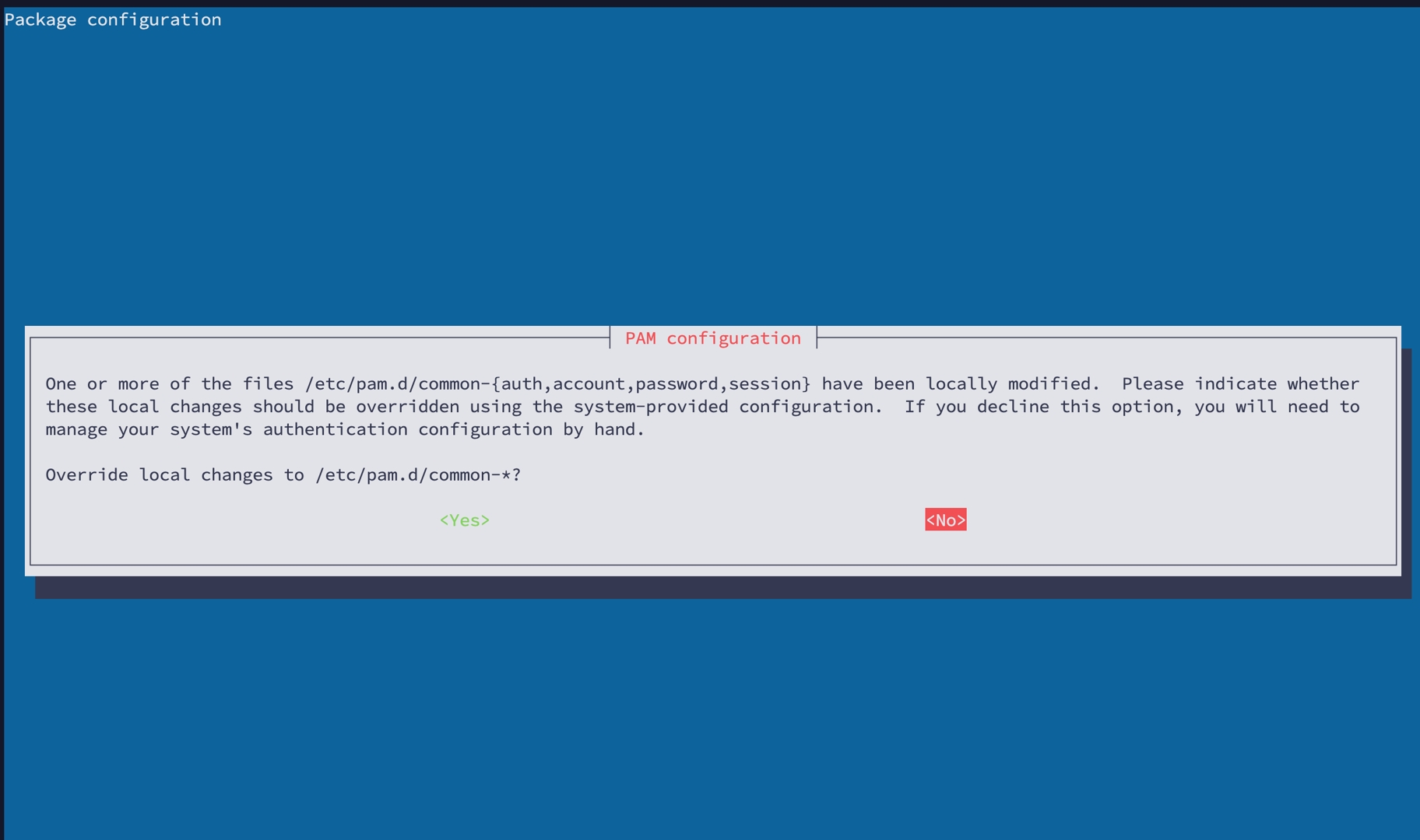 apt update && apt upgrade -y期间如果出现 PAM 配置提示窗口(是否覆盖 /etc/pam.d/common-*),