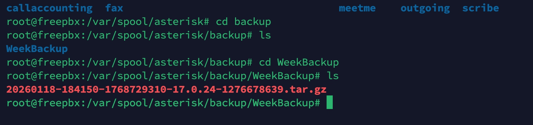 root@freepbx:/var/spool/asterisk/backup/WeekBackup#