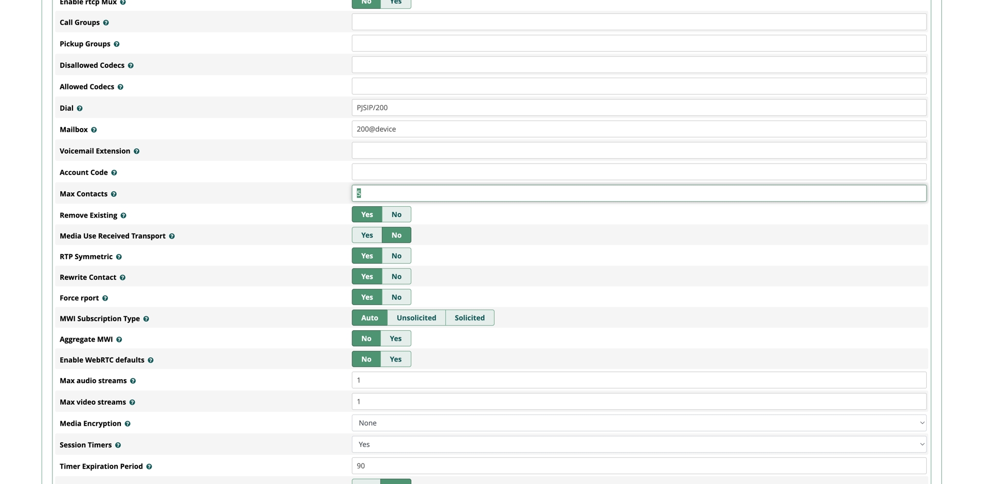 进入分机的 Advanced 页面,可以看到大量 NAT、RTP、Contact、Force rport 等选项。